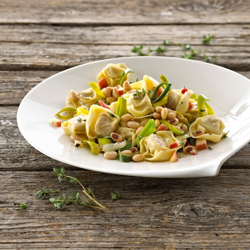 Sauter porrer i olie i en dyb pande. Tilsæt æbleeddike, æbler, timian og kog panden af. Skyl bønnerne i koldt vand og tilsæt dem. Kog pastaen efter anvisningen og vend den med bønnesauté. Smag til med salt og peber. Anret og server.