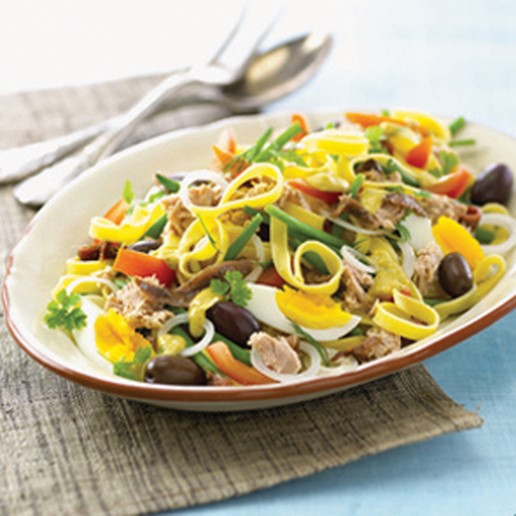 Kog pastaen efter anvisningen på emballagen. Hæld pastaen til afdrypning i en sigte og brus over med koldt vand til den er kold. Læg pastaen ud på et serveringsfad. Hæld vandet fra tun, og del den i mindre stykker. Kog bønnerne i letsaltet vand i ca. 2 min. og køl dem af i koldt vand. Anret alle ingredienserne på fadet sammen med pastaen. Rør dressingen sammen og smag den til. Hæld den over salaten ved serveringen.