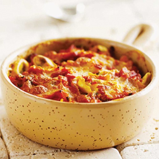 Gratineret pastaret - tortellini med tomat, mozzarella og bacon