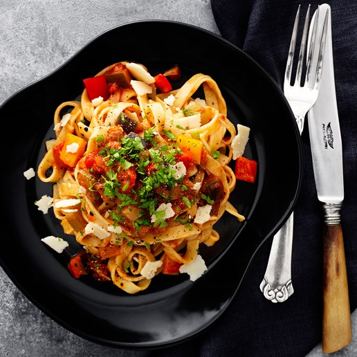 Grøntsagspasta med blomkål, ratatouille, parmesanost og persille