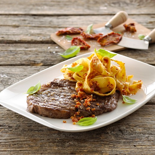Pappardelle med hjemmelavet pesto og grillet ribeye