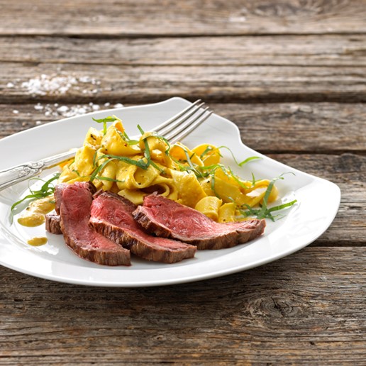 Pappardelle pasta med flankesteak og gul pebersauce