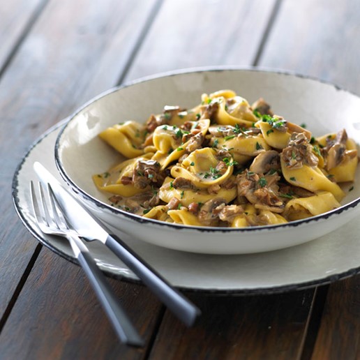 Pasta fyldt med kylling og hvidløg i en flødesovs med svampe og bacon.
