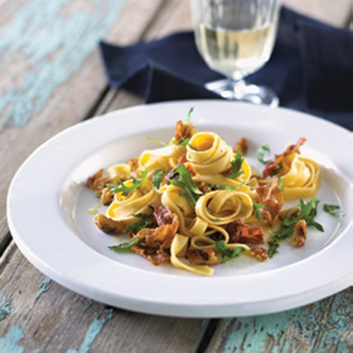 Hak valnødderne groft og læg dem til side. Vask rucolaen, tør den godt og hak den groft. Hæld lidt olivenolie på en stor pande og steg valnødderne med parmaskinken skåret i brede strimler i 5-6 min. Hæld nu bouillon ved og lad den delvis fordampe. Kog imens pastaen efter anvisning på pakken. Tag pastaen op og kom den over på panden. Bland rucolaen i og server straks.