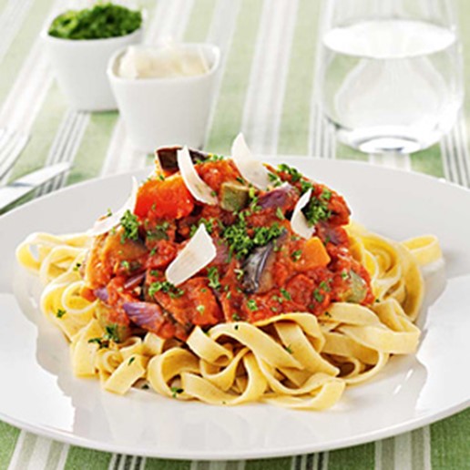 Bland fettuccine og ratatouillen sammen, og anret med parmesanosten og den hakkede persille ovenpå.
