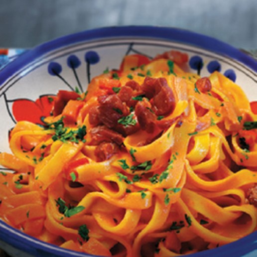 Steg baconen på en pande. Når den er gylden tages en 1/3 op og lægges til side. Tilsæt løg og svits i ca. 2 min. Tilsæt derefter de hakkede tomater og lad det hele simre i ca. 10 min. Tilsæt til sidst fløden og kog op. Smag til med salt, peber og lidt sukker. Kog imens pastaen efter anvisning på pakken. Tag pastaen op og arranger på en tallerken med tomatflødesaucen over. Pynt med resten af baconen og friskhakket persille.