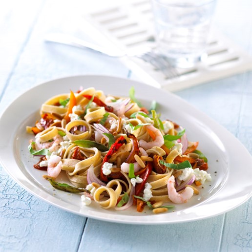 Kog pastaen som angivet på emballagen, hæld vandet fra og skyl pastaen i koldt vand. Klip evt. pastaen i kortere stykker. Bland pastaen med peberfrugt, rødløg, tomater, rejer og basilikum. Vend forsigtigt hytteosten i pastaen. Drys med pinjekerner og peber.