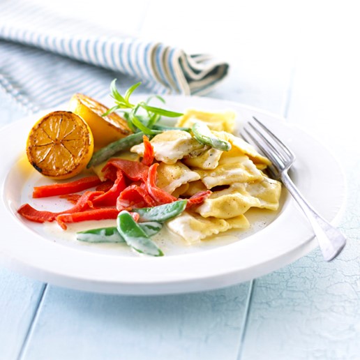 Del citronen i halve og rist dem på snitfladen på en varm pande. Tag citronerne af panden. Tilsæt hvidvin og lad det koge halvt ned. Tilsæt derefter ærter, fløde og cremefraiche. Lad saucen koge igennem og smag den til med salt, peber og muskatnød. Kog pastaen efter anvisningen på emballagen. Skær laksen i strimler, anret med pasta, sauce og citron og pynt med friske estragonblade.