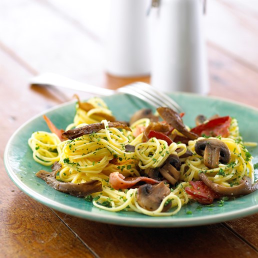 Steg bacon sprødt og læg det på fedt sugende papir. Steg svampene i olivenolie ved jævn varme i ca. 5 min. eller til vandet er væk. Drys med salt og peber. Kog spaghetti efter anvisningen på emballagen. Bland den afdryppede pasta sammen med bacon i mindre stykker, de stegte svampe og persille.