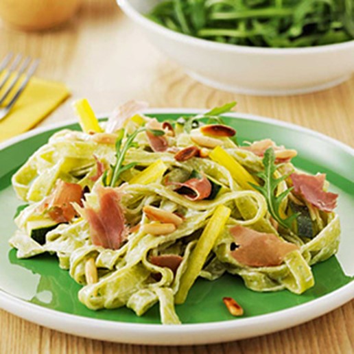 Spinatpasta med lufttørretskinke, pinjekerner og gorgonzolasauce