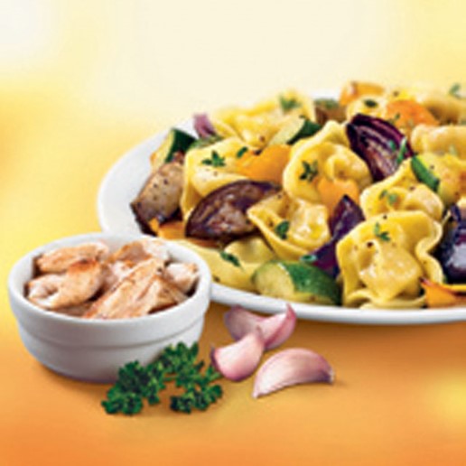Tortellini med kylling serveret med grillede grøntsager og frisk timian